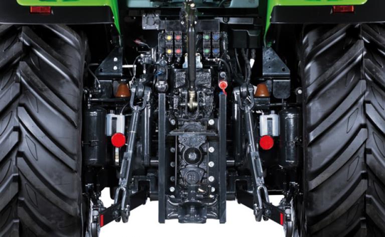 The front axles specially developed for the 120 to 140 HP class are new. These were developed with the aim of providing traction, grip and safety on all ground conditions and in all situations. Four-wheel and differential lock (100 %) can be activated and deactivated by electro-hydraulic controls, and both are automatically controlled by the ASM system depending on steering angle and speed. All new 6 Series models can optionally be fitted with a suspended front axle. The suspension travel has been maximised with double-acting cylinders. This significantly increases driving and working comfort as well as traction and safety both in the field and on the road. The SDD rapid steering system is also available for all new models. It halves the number of turns of the steering and makes manoeuvring much more efficient. As always with DEUTZ-FAHR, excellent safety features come as standard. The new 6 Series models are equipped with a four-wheel braking system, and a Hydraulic Parking Brake (HPB). A trailer brake (hydraulic, pneumatic or both) is available on request.